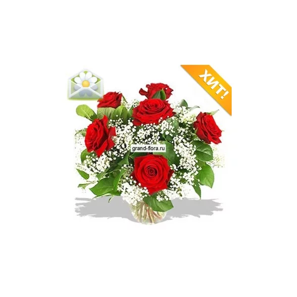 Этот букет неспроста назван именем греческой богини любви Афродиты. Ведь идеальное сочетание насыщенных красных роз и белой гипсофилы символизирует страсть, чувства, искренность. От этой цветочной композиции так и веет волнительной атмосферой любви.