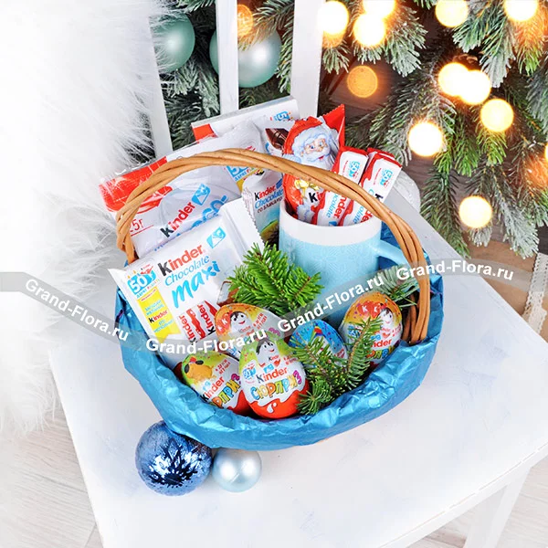 Стандартный: киндер "Maxi" - 84 г., киндер "Choco-Bons" - 125 г., киндер "Bueno" - 43 г., киндер "Сюрприз" - 4 шт., киндер "Дед Мороз" - 110 г., киндер "chocolate maxi" - 2 шт., киндер со злаками - 23,5 г., кружка - 1 шт., ель, декор, корзина малая.